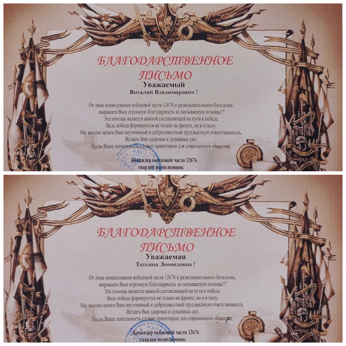 Нашим товарищам: депутату Совета депутатов Каланчакского муниципального округа Виталию Сметанину и председателю Совета Скадовского местного отделения Партии СПРАВЕДЛИВАЯ РОССИЯ – ЗА ПРАВДУ Татьяне Калиновской за многократную и весомую помощь бойцам на фронте были вручены благодарственные письма от командования войсковой части 12676 и разведывательного батальона.