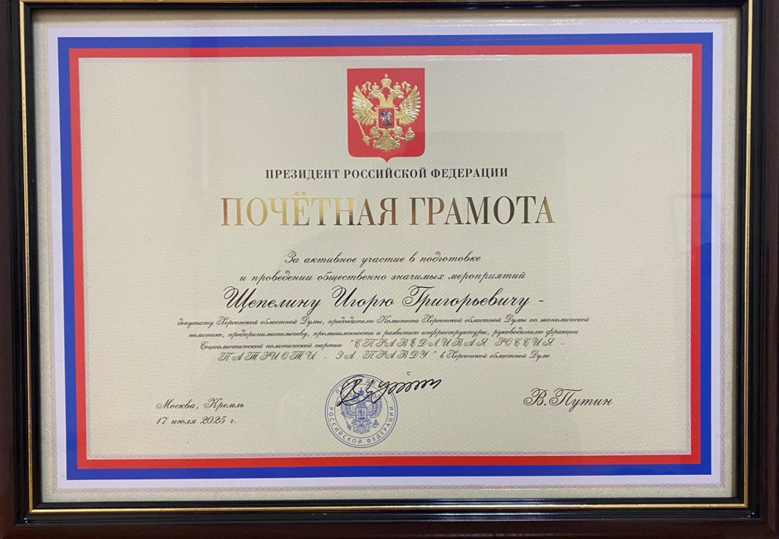 Председатель Совета регионального отделения Игорь Щепелин удостоен Почётной грамоты Президента Российской Федерации