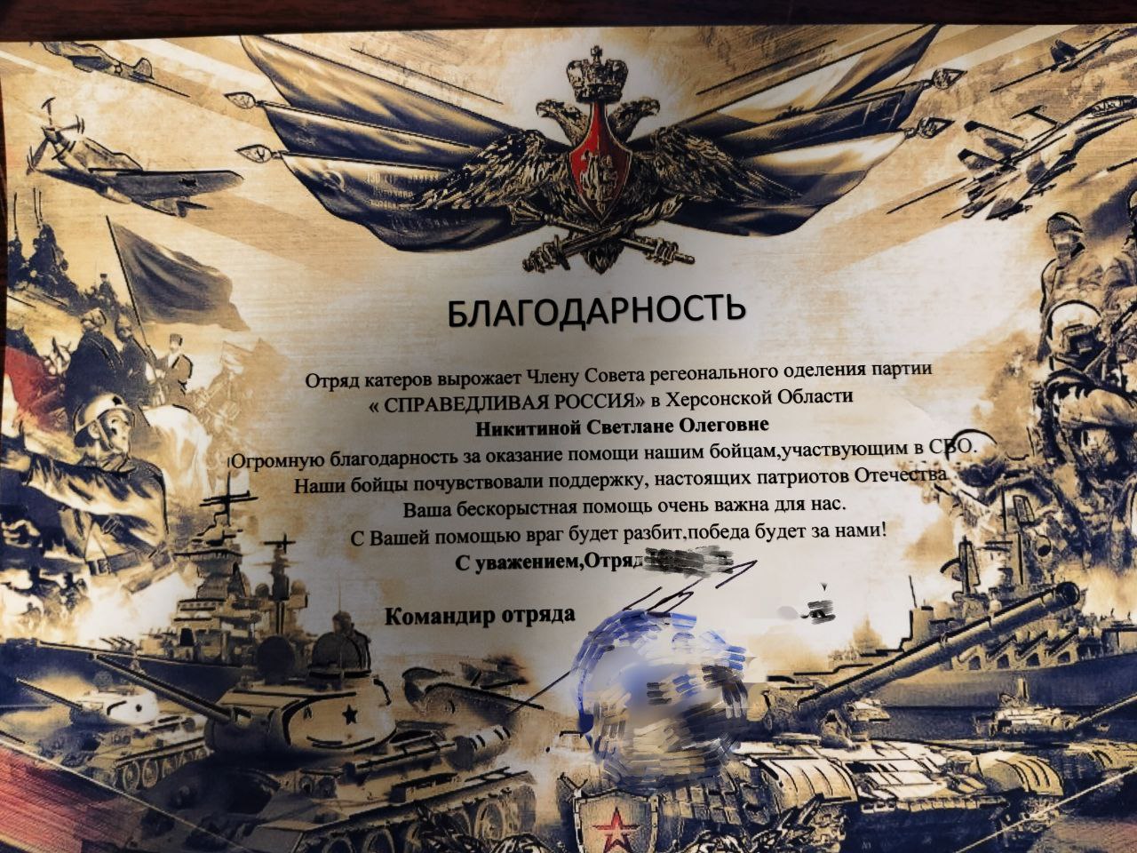 Светлане Олеговне была вручена Благодарность отряда катеров за оказание помощи бойцам, участвующим в СВО, за подписью командира отряда.